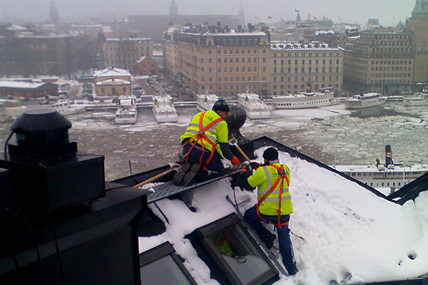 Varje år skadas personer och egendom till följd av nedfallande is och snö så vänta inte på att mildare väder ska lösa snöproblemet. Vi på Lassfolks har kompetens och erfarenhet av att skotta snö på de mest komplicerade och utsatta av områden. Naturligtvis avlastar vi även platta tak.
